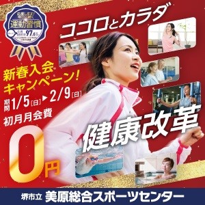 /ココロとカラダ健康改革\#美原総合スポーツセンターでは、新春キャンペーンを1月5日(日)~2月9日(日)の期間開催初月月会費無料でトレーニング室やプールをご利用いただけます!この機会に、是非ご登録く..