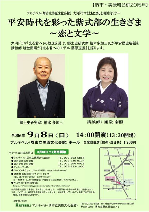 \平安時代を彩った紫式部の生きざま~恋と文学~/9/8(日)14時~、美原文化会館で、堺市・美原町合併20周年を記念した歴史セミナーが開催されます。大河ドラマでも描かれている平安時代の歴史秘話や、藤原..