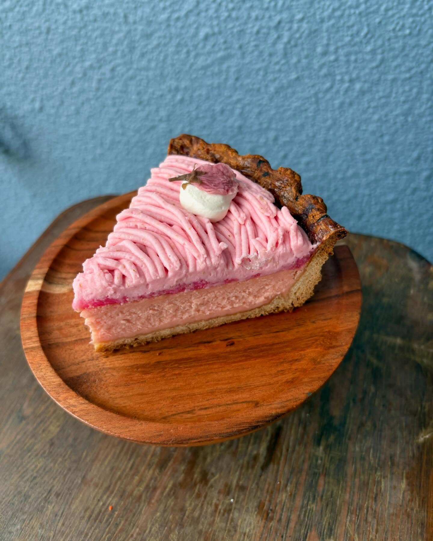 .【桜のタルト】箕面製餡さんの桜餡を練り込んだ自家製チーズケーキの上に箕面製餡さんの桜餅を敷きその上に桜モンブランと自家製ホイップクリーム、桜の塩漬けをトッピングしています🌸目からも美味しい色鮮やかな..