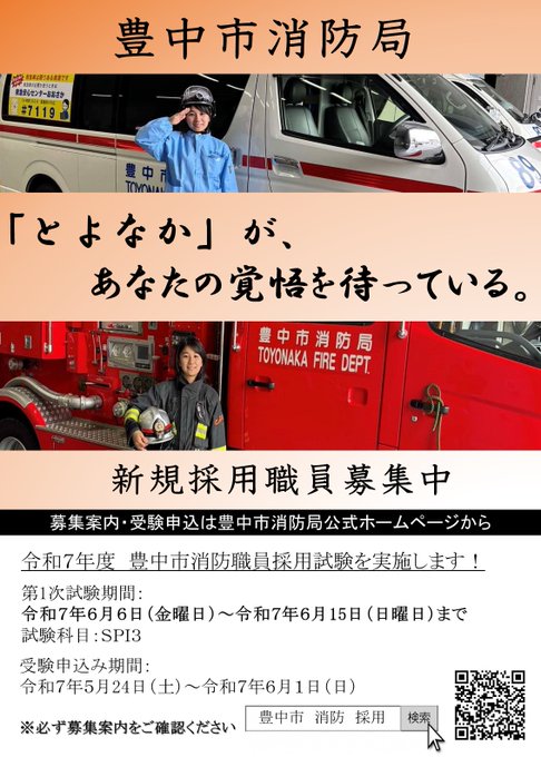 令和7年5月24日(土)より新規採用職員の募集を開始します。https://city.toyonaka.osaka.jp/kurashi/bosai/toyonakafiredept/shobosai..