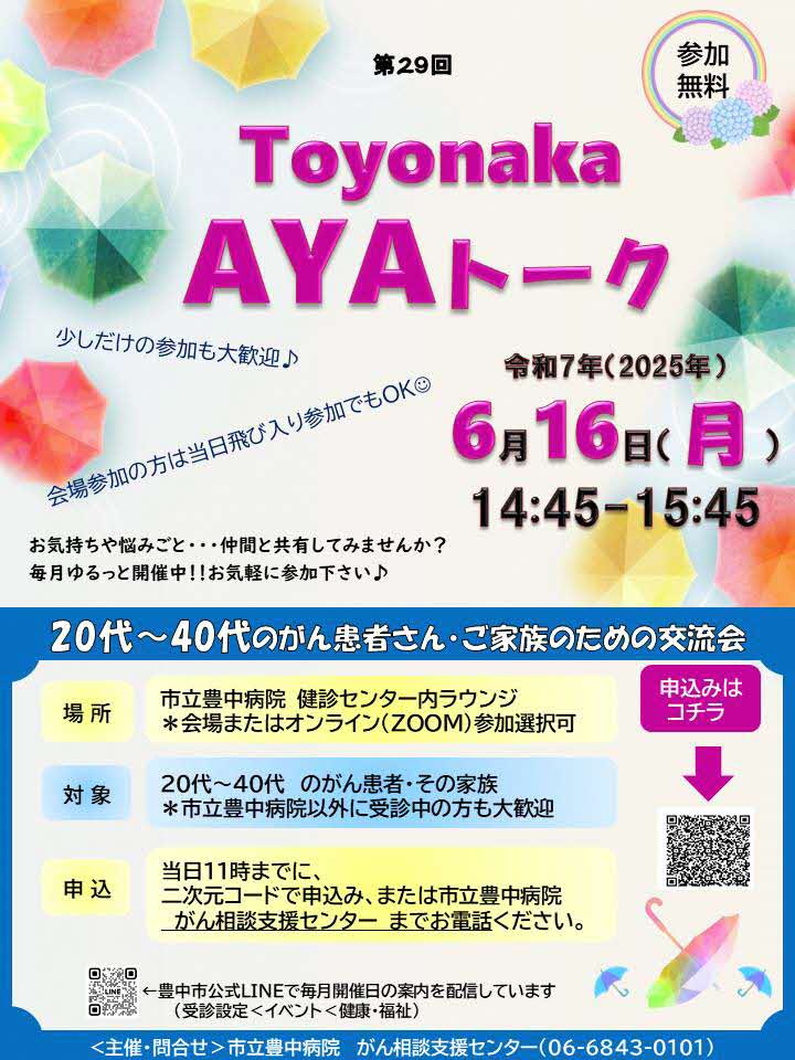 /市立豊中病院がん相談支援センターより6月16日(月)14時45分~15時45分AYAトーク開催のお知らせ\性別・がん種問いません◎オンライン参加も◎詳細はこちら▼https://city.toyon..