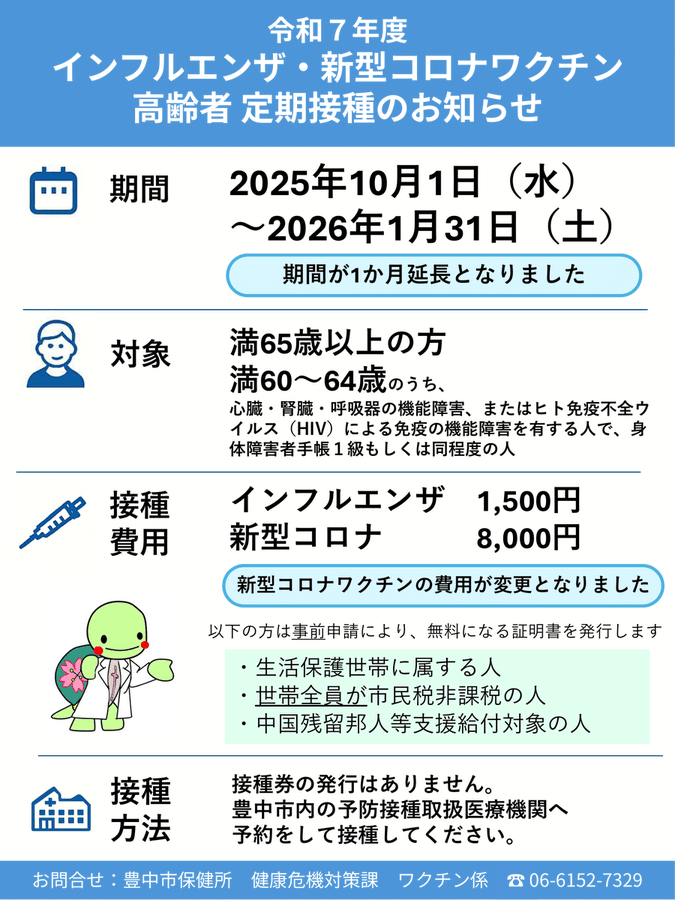 \高齢者#インフルエンザ・新型#コロナワクチン/10月1日から65歳以上の人を対象に定期接種がはじまります接種券の発行はありません。希望する人は、豊中市内の取扱医療機関へ予約をして接種できます。htt..