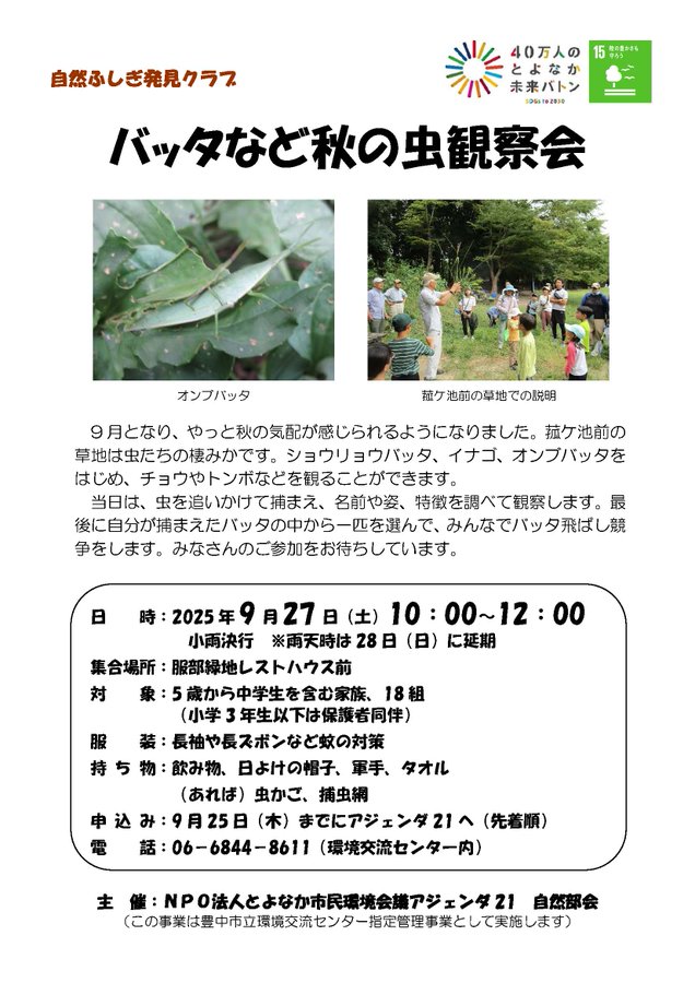 \バッタを捕まえよう!/『バッタなどの秋の虫観察会』秋になると、たくさんの昆虫たちに会えます!どれだけ飛ぶかを競う、バッタのオリンピックも行います!日時9月27日(土)10:00~12:00場所服部緑..