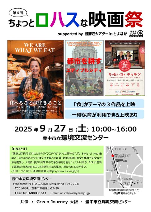 ちょっとロハスな映画祭『ちょっとロハスな映画祭』’食’がテーマな3作品を上演します日時9月27日(土)10:00~16:00場所環境交流センター申込9月4日(木)参加費1200円└事前予約の場合、お安..