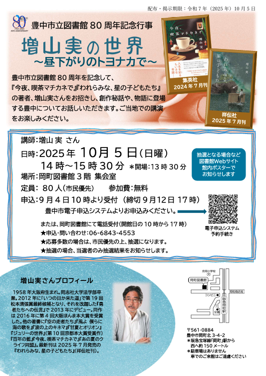 ╋━━━━━━━━━増山実の世界~昼下がりのトヨナカで~━━━━━━━━━╋豊中市立図書館80周年を記念し作家の#増山実さんの講演会を行います日時:10月5日14時から場所:#岡町図書館▽申込はこちら..