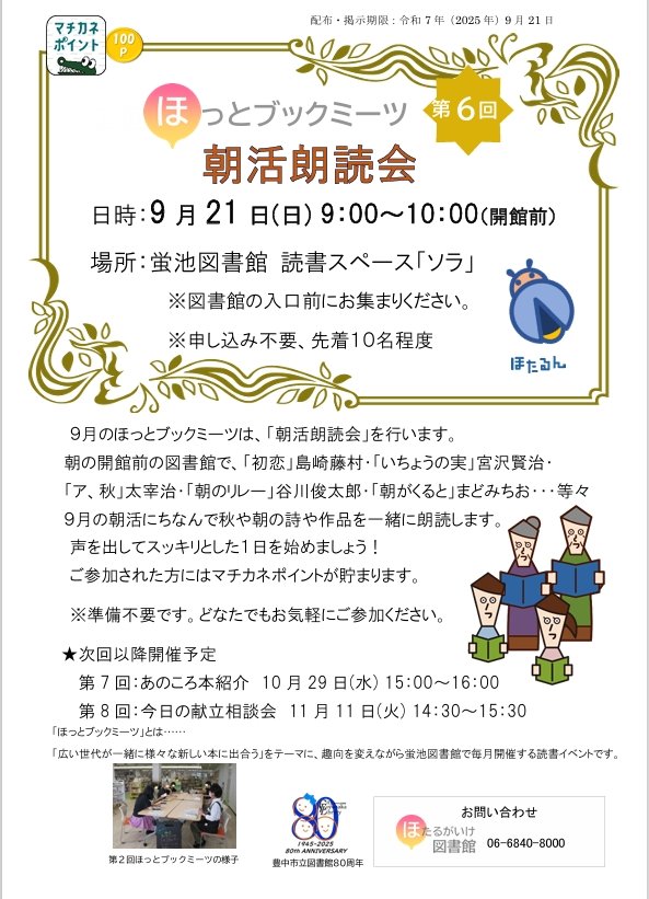/朗読から1日を始めてみませんか?\開館時間前の#蛍池図書館で、「朝活朗読会」を開催。みんなで秋や朝にちなんだ作品を朗読します♪#朝活で、充実した1日をお過ごしください。マチカネポイントもたまります!..