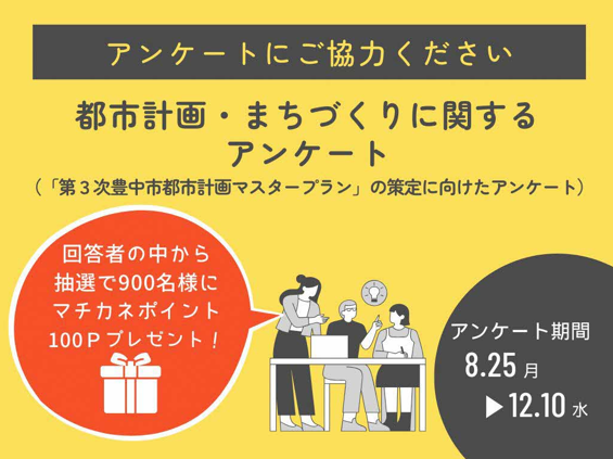 \まちづくりのためのアンケートにご協力を/豊中市のこれからのまちづくりのためにアンケートを実施しています。令和7年12月10日までに回答いただくと、抽選で900名にマチカネポイント100Pを進呈。豊中..