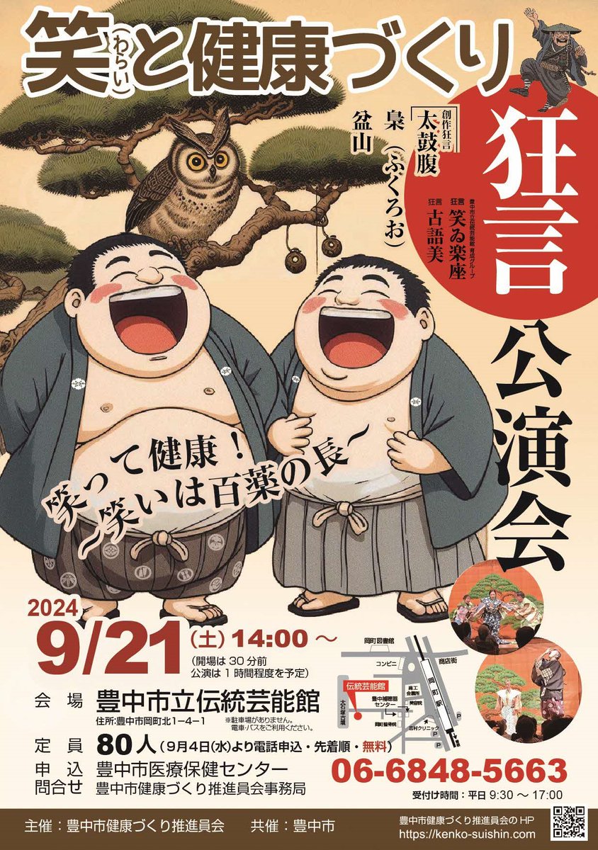 笑(わらい)と健康づくり狂言公演会(#豊中市健康づくり推進員会主催)は、9月21日(土)14時~伝統芸能館で開催♪創作狂言「太鼓腹」等で楽しく笑って元気UP!参加無料☆本日9月4日から電話申込み受付中..