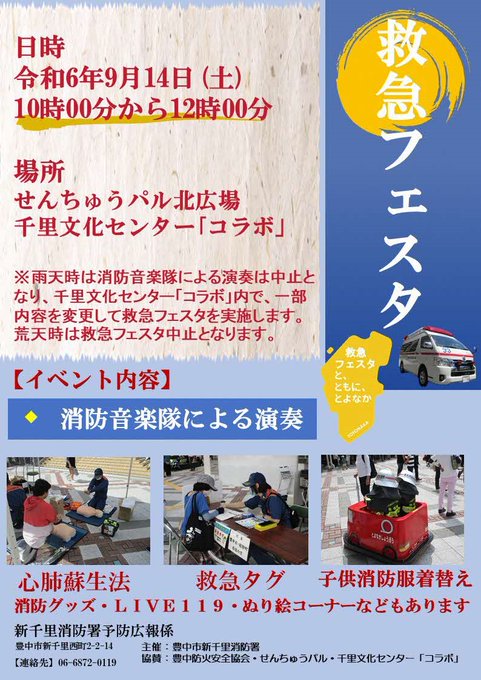 ♬消防音楽隊のお知らせ♬♪救急フェスタに消防音楽隊が出演します♪日時:令和6年9月14日(土)10:05~10:45場所:せんちゅうパル北広場(新千里東町1丁目5番)皆さまのご来場を、心よりお待ちして..