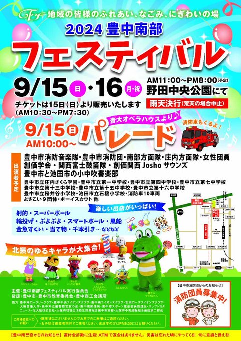 ♬消防音楽隊のお知らせ♬♪豊中南部フェスティバルに消防音楽隊が出演します♪日時:令和6年9月15日(日)パレード10:00~ステージ演奏12:10~12:30場所:野田中央公園(野田町9)皆さまのご来..
