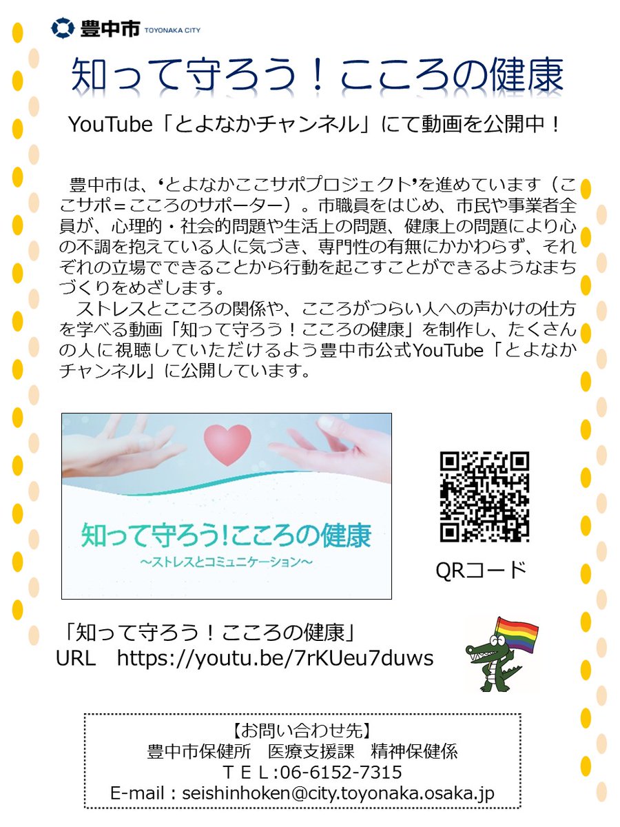 "「とよなかこころのサポーター」になりませんか?#こころのサポーターとは、こころの不調のサインに気づき、こころの応急手当ができる人のこと。「知って守ろう!こころの健康」の動画を見て、こころがつらい人へ..