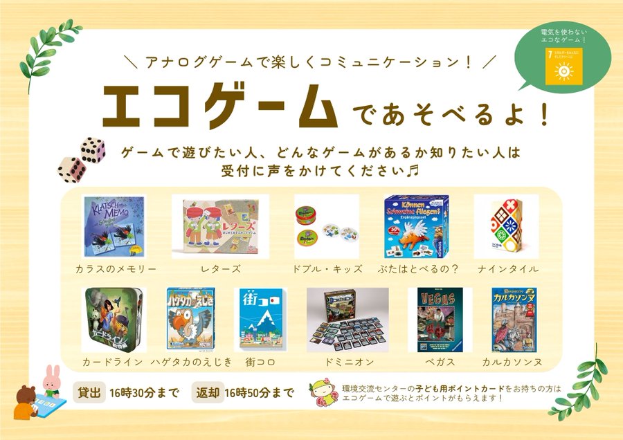 \「エコゲーム」貸出中/電気を使わない、みんなで楽しめるゲームを窓口で貸出中どなたでもOK16:30までに借りて、16:50までに返却を!館内限定&備品確認も忘れずに開館日はいつでも利用可