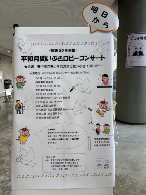 #青少年交流文化館いぶきです。明日から高校生による「平和月間いぶきロビーコンサート」を開催。19日#桜塚高校・20日#豊中高校・22日#渋谷高校は16時スタート、23日は#刀根山高校#大商学園高校に宮..