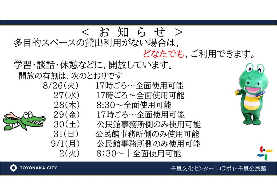 #千里公民館 #千里文化センターコラボ です。 学習、休憩などに、多目的スペースを開放します。 急遽、利用が入った場合は、開放を中止する場合があります。 #豊中市教育委員会 #自習スペース