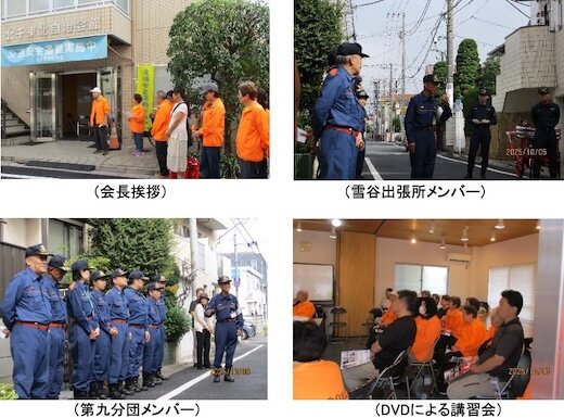 防災訓練スケジュール 8:00 自治会役員集合・車輪付き担架組立、放水ポンプ試運転等・参加者への飲料水、粗品準備等9:00 開会式・主催者挨拶 深澤会長・田園調布消防署雪谷出張所所長挨拶 町田所長