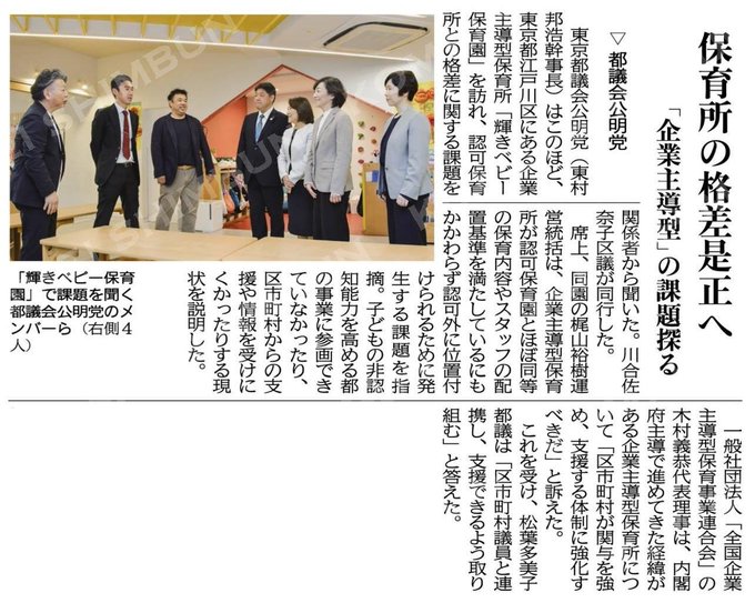 保育所の格差是正へ/「企業主導型」の課題探る/都議会公明党#公明新聞電子版2024年12月14日付https://komei.or.jp/newspaper-app/先日、企業主導型保育施設を視察した..