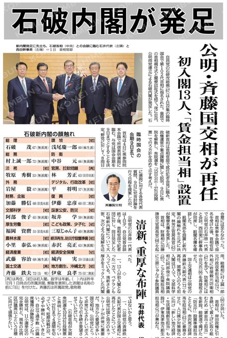石破内閣が発足/公明・斉藤国交相が再任/初入閣13人、「賃金担当相」設置#公明新聞電子版2024年10月02日付https://komei.or.jp/newspaper-app/