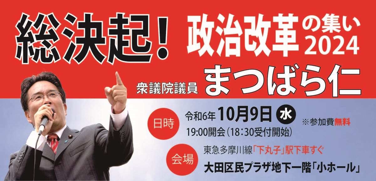 来る10月9日(水)19時より政治改革実現を訴える決起集会を行います。新政権発足直後ですが、当日は衆議院解散とも報道される日。ぜひ多くの皆様に奮ってご参集賜りますようお願いいたします。下記リンクよりお..