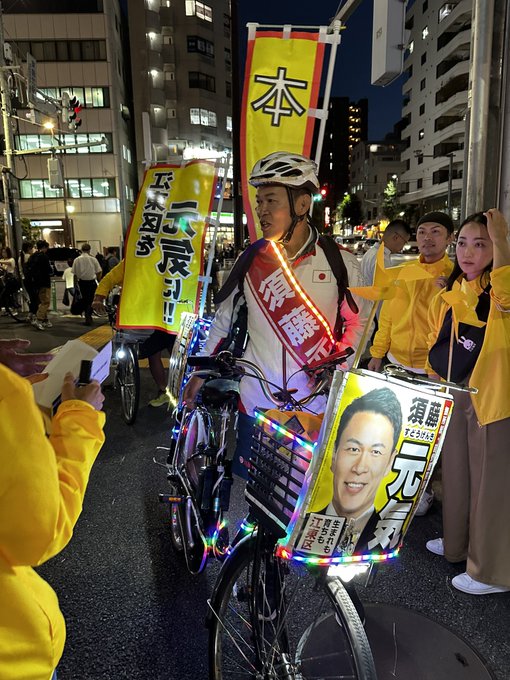 東京メトロ東陽町にデコチャリ須藤元気候補が到着 これから駅前にて街頭演説が始まります!! #江東区 #東京15区