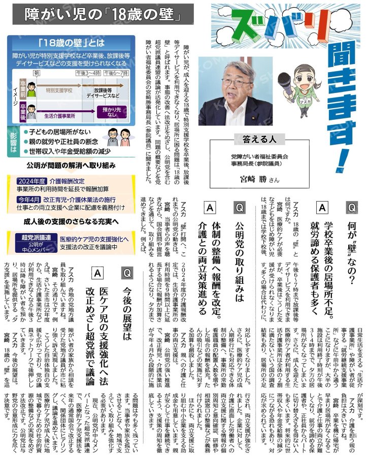 (ズバリ聞きます!)障がい児の「18歳の壁」/答える人=党障がい者福祉委員会事務局長(参院議員)宮崎勝さん#公明新聞電子版2025年09月07日付18歳の壁。以前から障がい者団体の方々よりご相談を頂い..