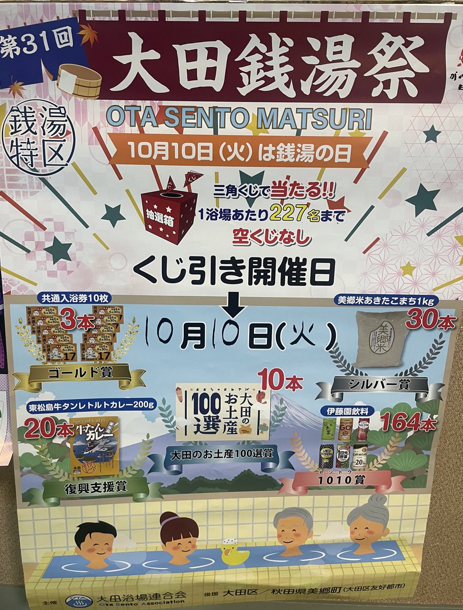 お知らせ😊10/10(火)は1010で銭湯の日♨️12時開店で大田銭湯祭やります♨️皆様に感謝の気持ちを込めて空くじなし🎯先着227名なので、夜にはなくなるかもしれません😔当日の状況をまたお知らせしま..