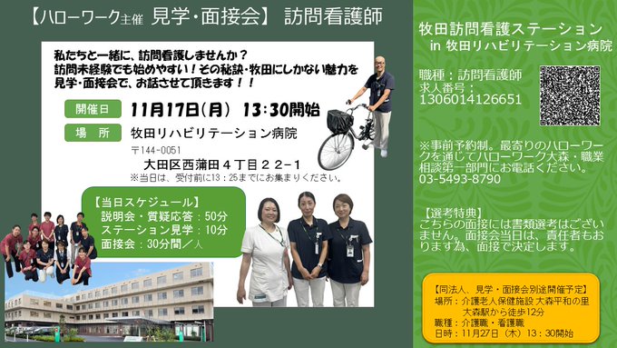 #見学会#面接会11月17日(月)13:30〜会社見学・面接会(希望者のみ)を開催!開催場所:#牧田リハビリテーション病院書類選考なし事前予約制必ずお電話にてお問い合わせください詳細は#ハローワーク大..