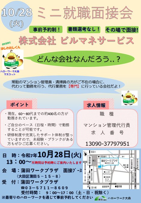 ミニ面接会10月28日(火)13:00〜株式会社ビルマネサービス#面接会を蒲田ワークプラザにて開催!!事前予約制書類選考なし60歳以上最寄りのハローワークを通じて、お申込みください。詳細は#ハローワー..