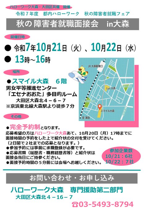 #秋の障害者就職フェアin大森10月21日(火)・10月22日(水)13時〜#スマイル大森6階にて#面接会開催!!2日間で13社の企業が参加します!完全予約制(締切10月20日17時)詳細は#ハローワ..