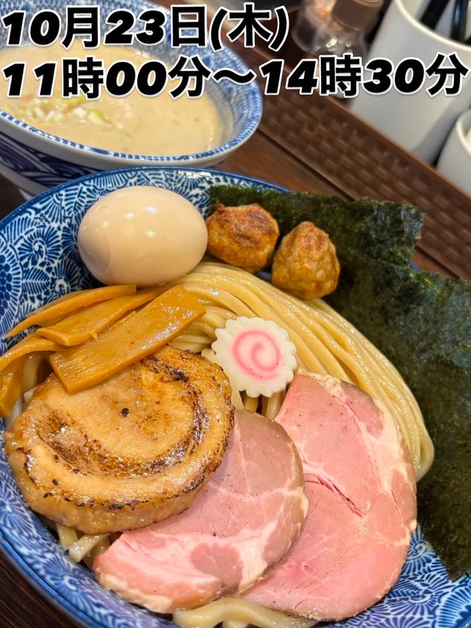 10月4日(土) 11時00分〜14時30分で営業します。 限定15食で濃厚えびつけ麺 季節限定でつめたいまぜそばございます。つめたいまぜそばは在庫限りで終了します。 本日もご来店お待ちしております