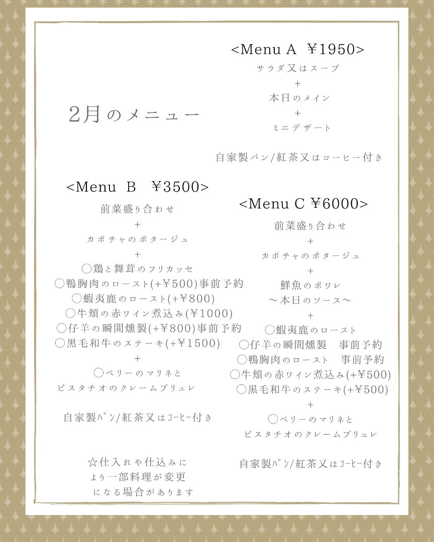 川越蔵造りモンノールです。来月2月のメニューです。今回はお選び頂けるお料理お多いですが、来月で最後..