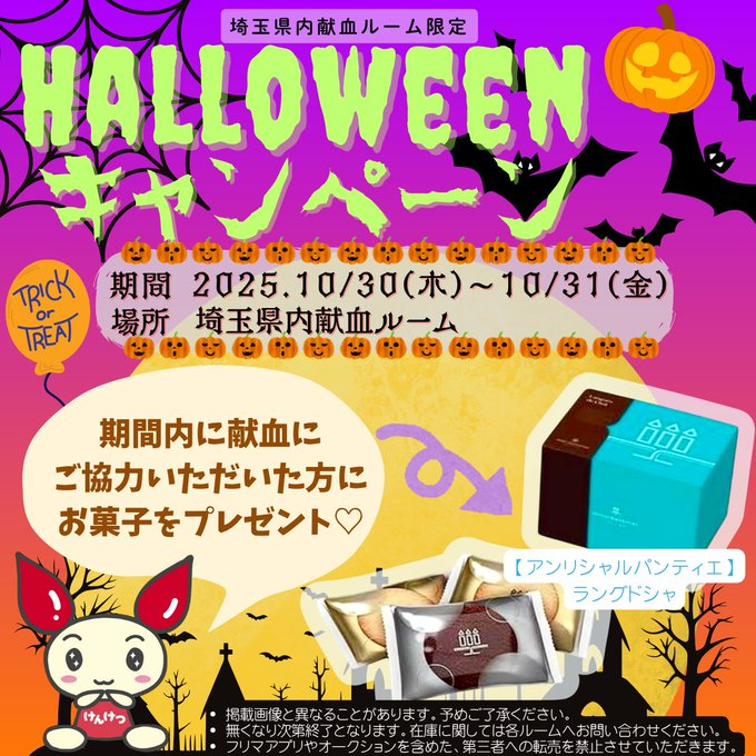 ハッピーハロウィーン献血ご協力いただいた方にお菓子プレゼントのキャンペーンを行っております※無くなり次第終了となります本日も400mL献血ご協力頂ける方大募集しておりますのでこの機会にぜひお越しくださ..