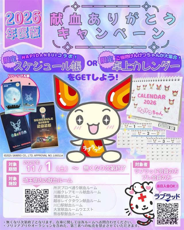 献血ありがとうキャンペーンサンリオコラボのスケジュール帳orけんけつちゃんの卓上カレンダーをプレゼント※無くなり次第終了となります。対象者:ラブラット会員の方で献血ご協力頂いた方400mL献血ご協力頂..
