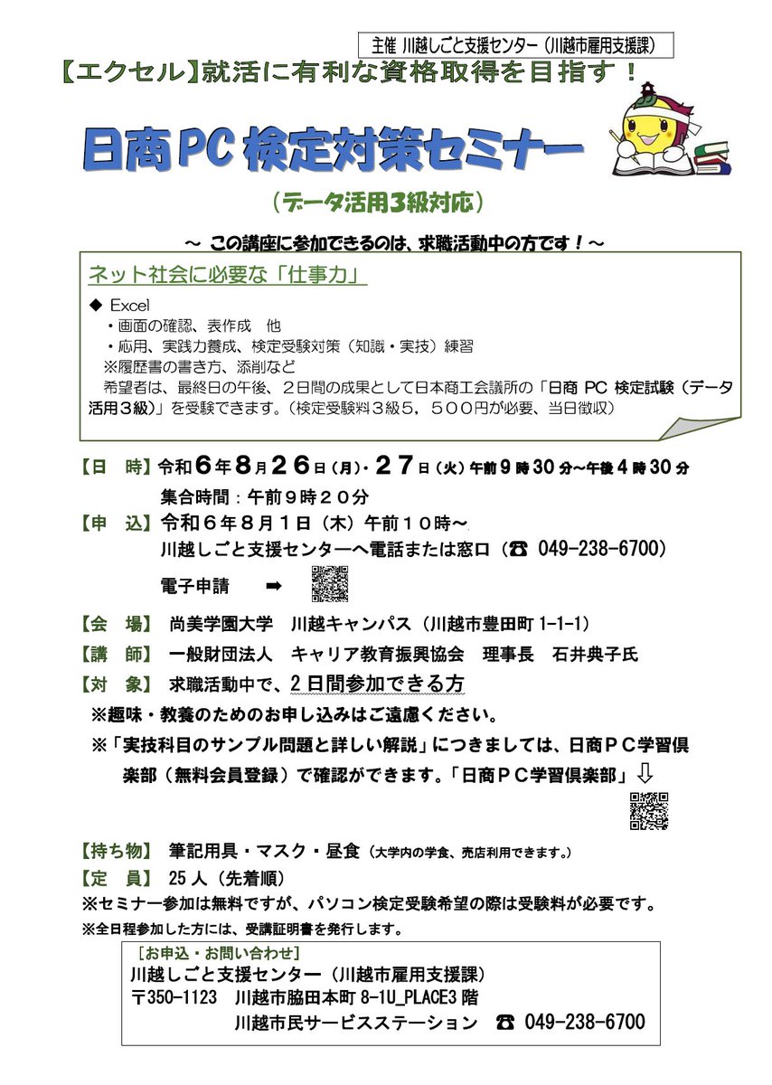 雇用支援課です。【日商PC検定対策セミナーのご案内】まだ、間に合う!夏の間にスキルアップ!求職者の方を対象に(文書作成3級、プレゼン資料作成3級)セミナーを実施します。申し込み受付中。詳しくはこちらh..