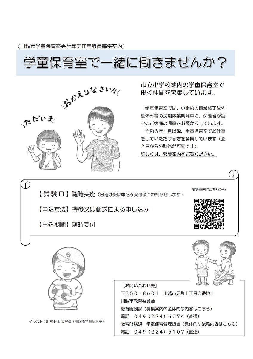 教育財務課です。学童保育室で一緒に働く放課後児童支援員・補助員を募集しています。年齢や経験は問いません!マニュアル完備で安心スタート!充実の研修制度でスキルアップできます。子どもたちと一緒に成長できる..