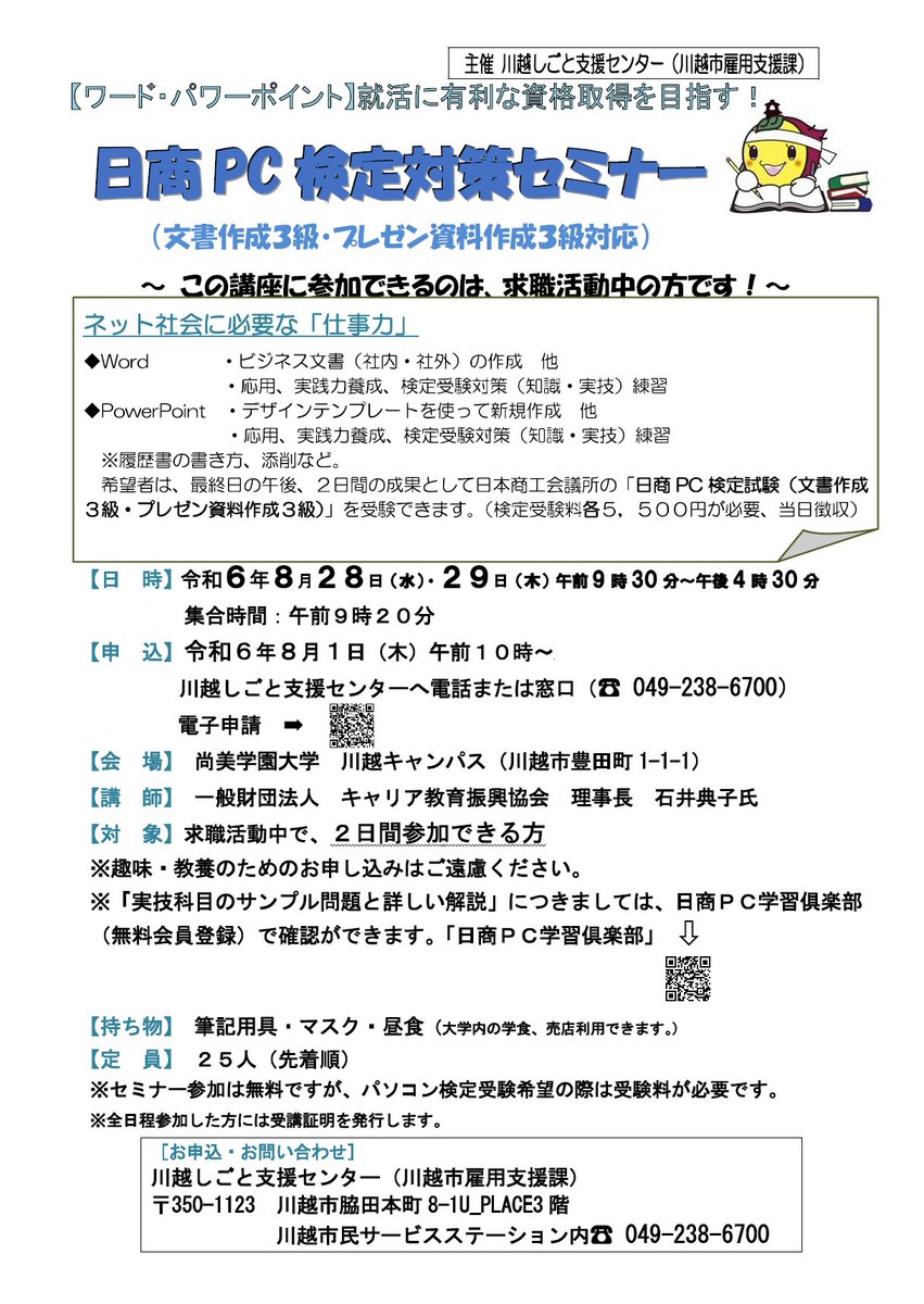 雇用支援課です。【日商PC検定対策セミナーのご案内】まだ間に合う!夏の間にスキルアップ!求職者の方を対象に(文書作成3級、プレゼン資料作成3級)セミナーを実施します。申し込み受付中。詳しくはこちらht..
