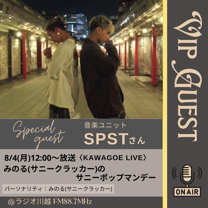 【ゲスト情報】8/4(月)12:00~放送〈KAWAGOELIVE〉みのる(サニークラッカー)のサニーポップマンデーのゲストは、SPSTさんです。------初めまして。SPSTです!ジャンルとしては..