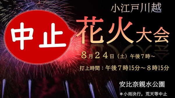 8/24安比奈親水公園で開催が予定されていた第31回小江戸川越花火大会は、荒天のため中止が決定されました。※順延・延期なし有料桟敷席(市民向け・シングル席・駐車券付きグループ席)のチケットの払い戻しに..
