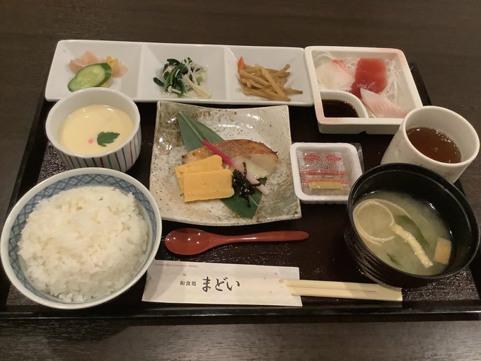 2024年8月25日(日)本日の朝食献立は・前菜3点盛り(小松菜と油揚げのお浸しきんぴらごぼう漬物)・刺身3種(鮪カンパチ鯛)・赤魚の西京焼・茶碗蒸し・納豆・ご飯・味噌汁当日朝の仕込み状況等により一部..