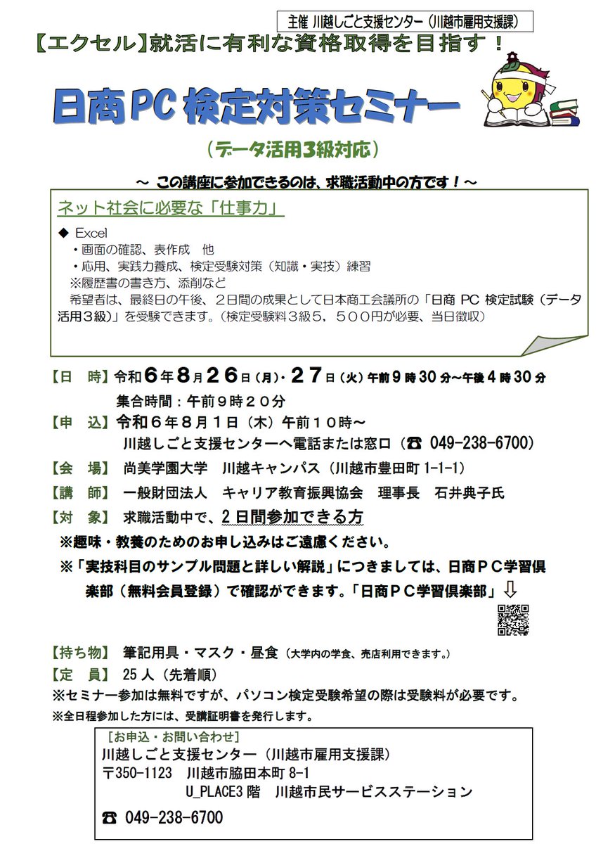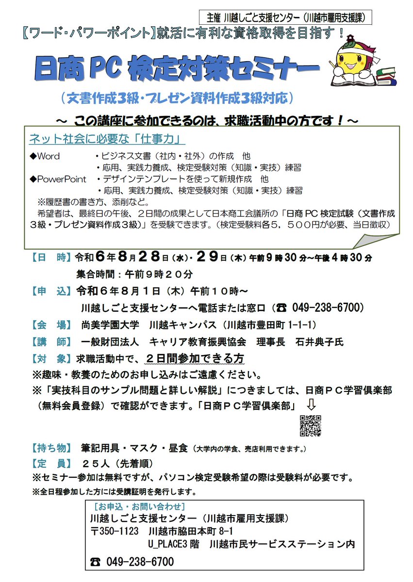 雇用支援課です。【日商PC検定対策セミナーのご案内】まだ、間に合う!夏の間にスキルアップ!求職者の方を対象に(文書作成3級、プレゼン資料作成3級)セミナーを実施します。現在受付中。詳しくはこちらhtt..