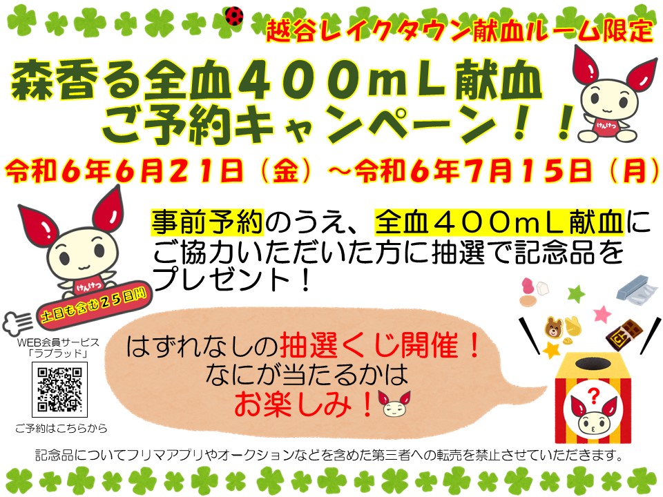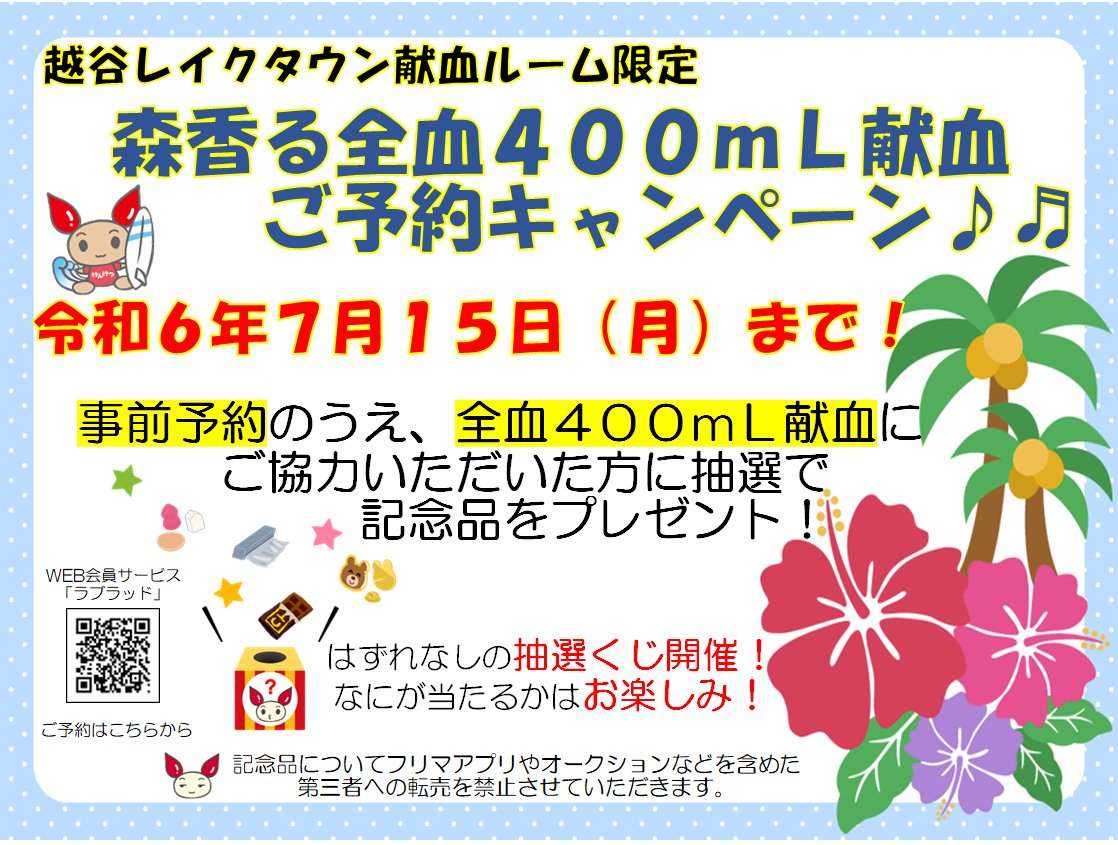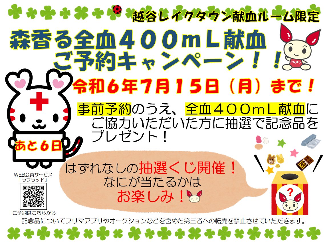 森香る全血400mL献血ご予約キャンペーンも間もなく終了となります 残すところあと3日 7月15日(月)海の日までです。 多くの方のご予約とご協力をお待ちしております #埼玉 #越谷レイクタウン #献血 #海の日