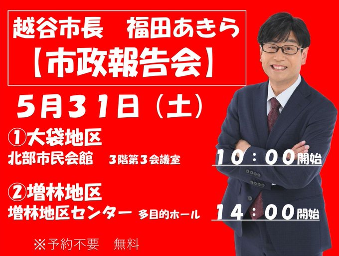 福田あきら市政報告会を実施します。市内13地区で実施中です!是非ご参加ください。①大袋地区5月31日(土)北部市民会館3階第3会議室10:00開始②増林地区5月31日(土)増林地区センター多目的ホール..