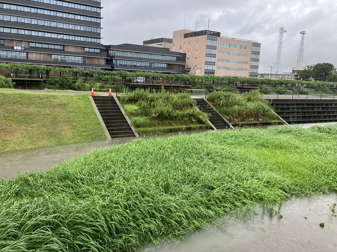 市役所脇にて。元荒川の水位が上がってきています。皆さん今後の雨に気をつけてください。