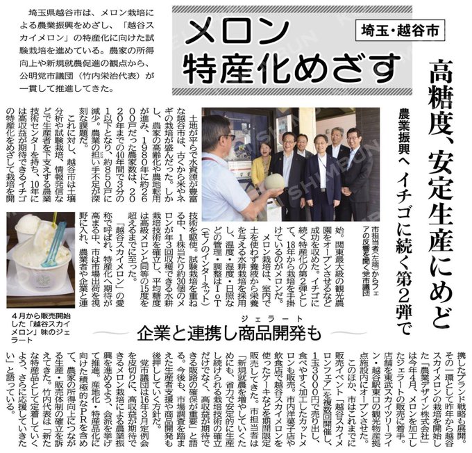 / メロンの特産化めざす \ 高糖度、安定生産にめど すっごく甘〜い 埼玉・越谷市 #公明新聞電子版 2024年08月30日付 https://komei.or.jp/newspaper-app/