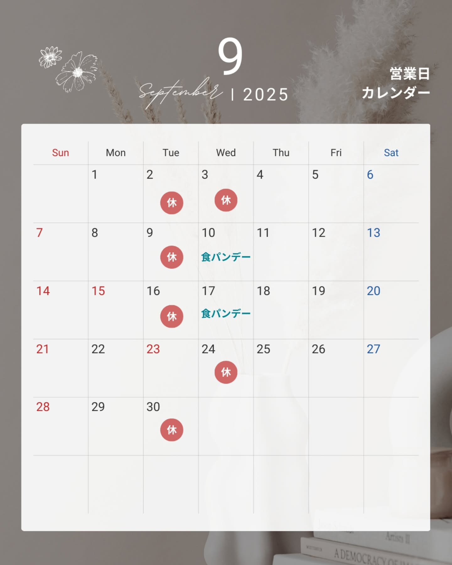 こんにちは😊ぴーぷる平方店です9月のお休みと食パンデーのお知らせですまだまだ暑いですがぴーぷる平方店では、秋商品を少しずつお出ししています。是非、お立ち寄り下さい🥖
