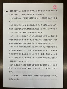 令和6年9月議会における一般質問。無事終わりました。今回は4項目。避難所について、民間委託契約の新たな仕組みについて、越谷市場について、奨学金返還支援について、など。