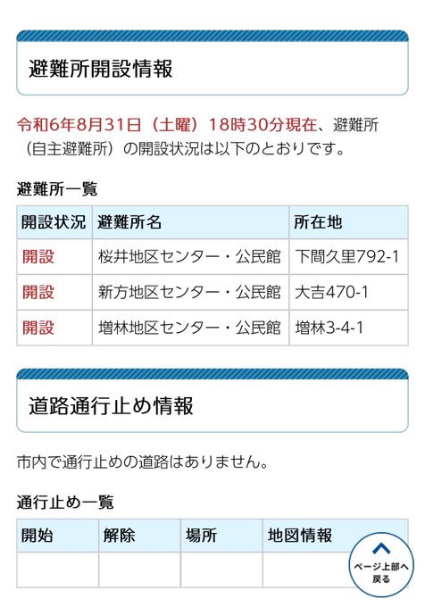 現在、越谷市内かなり強い雨が降っております。今後の雨の降り方について、どうなるか分からない状況ですので道路冠水や河川の氾濫等で不安のある方は下記の避難所へ予め避難をしてください。ご自宅2階への垂直避難..