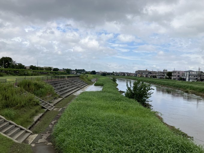 昨晩も越谷市は念のため自主避難所を開設しましたが、今朝閉鎖しました。所用で市役所を訪れましたが、元荒川も水位は戻り中土手の脇も下が見えるようになりました。…葛西用水は一面緑に。潮位の変化で行ったり来た..