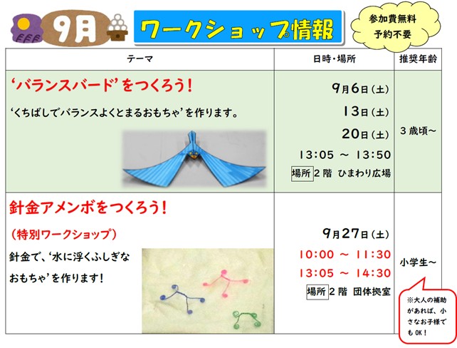 (#さいたま市 #青少年宇宙科学館 では毎週土曜日にワークショップを開催中!) 月替わりで小さなお子様から楽しめます☆9月のワークショップは「‘バランスバード’をつくろう!」と「針金アメンボをつくろう!」です。☆参加☆お待ちしております☆詳しくはリンク先へ。 https://city.saitama.lg.jp/kagakukan/event/p081433.html…