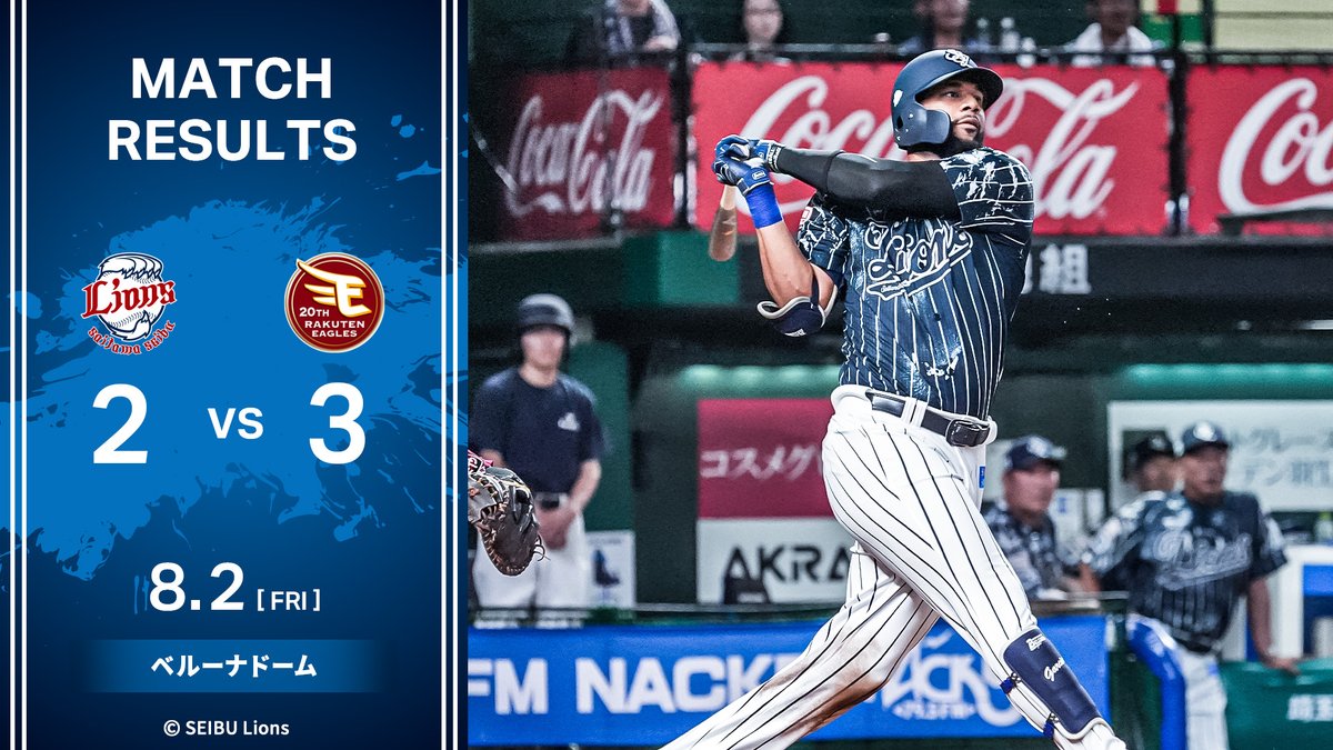 [8/2結果]L2-3E先制を許すも、3回に#野村大樹選手の本塁打で同点とします。4回には、#ガルシア選手の適時二塁打で勝ち越し。しかし、5回に逆転を許します。その後8回に好機を作りますが、追いつくこ..