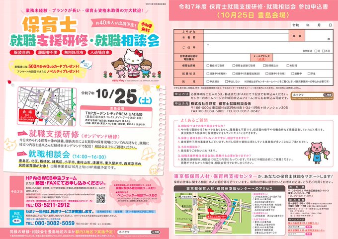 \就職相談会【豊島会場】申込受付中/ 10月25日(土)14:00~ TKPガーデンシティPREMIUM池袋にて 保育士就職相談会が行われます 対象区市の保育園担当者と直接話せるチャンス☆ 参加無料!履歴書不要! 保育コーディネーターや東京都によるベビーシッター業の相談ブースもあります♬